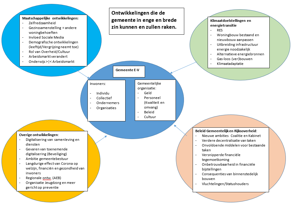 Onderstaand is een overzicht gemaakt van ontwikkelingen die het college, met de kennis van nu, ziet. Doel van dit overzicht is niet om een uitputtende lijst op te stellen maar vooral om periodiek met de raad van gedachte te wisselen over de verschillende onderwerpen. Naarmate deze ontwikkelingen concreter worden, kunnen deze ook beter beoordeeld worden op de impact voor de gemeente.